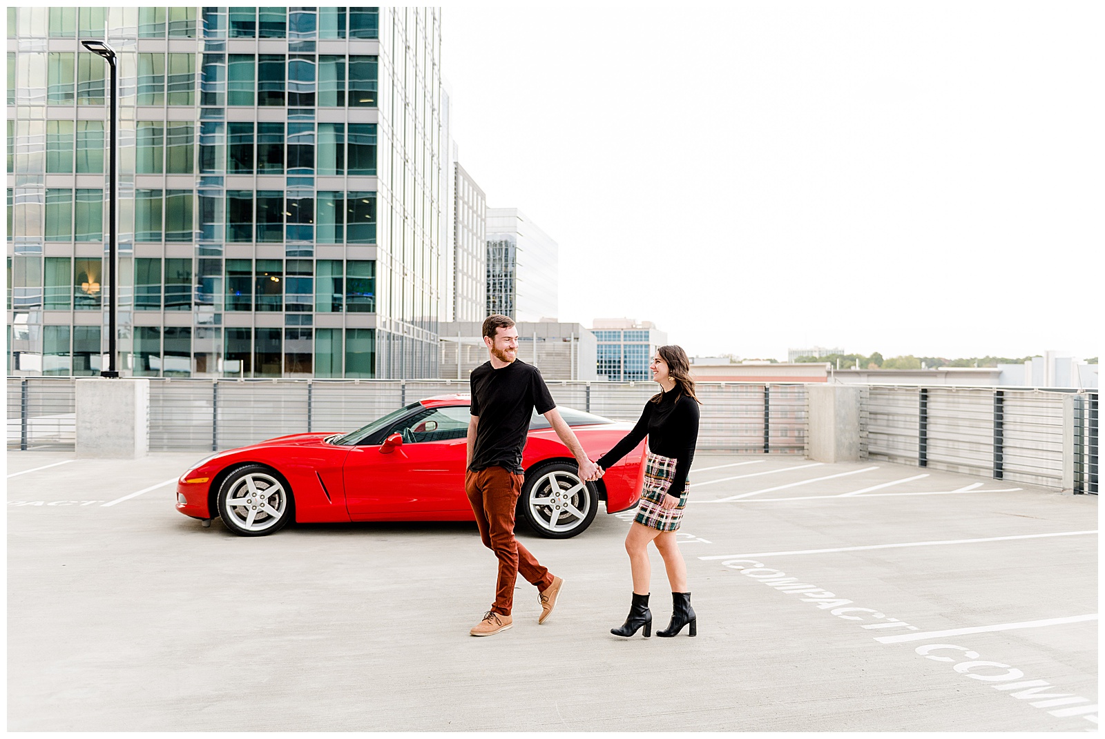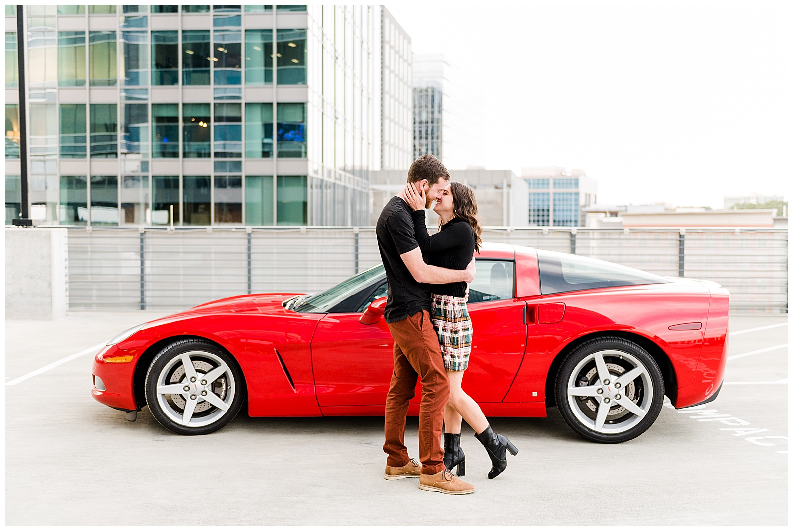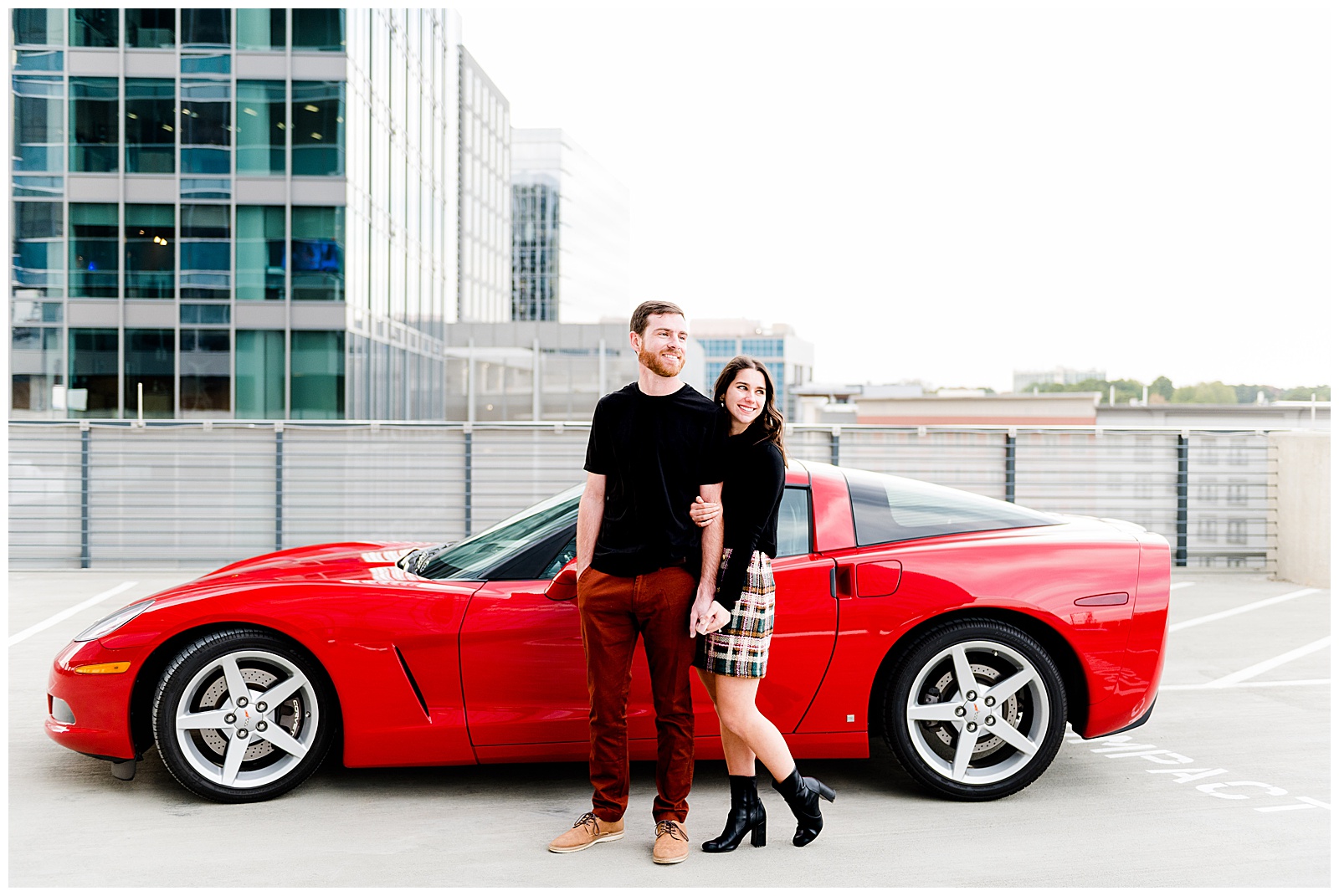 After a quick wardrobe change, we headed to a high-rise parking deck for those coveted car shots. This was my first session featuring a client’s vehicle, and I couldn’t have been more excited. While we thought the ground level was chilly, the exposed parking deck brought temperatures to a whole new level. But as we all agreed, the dramatic backdrop was absolutely worth braving the cold.